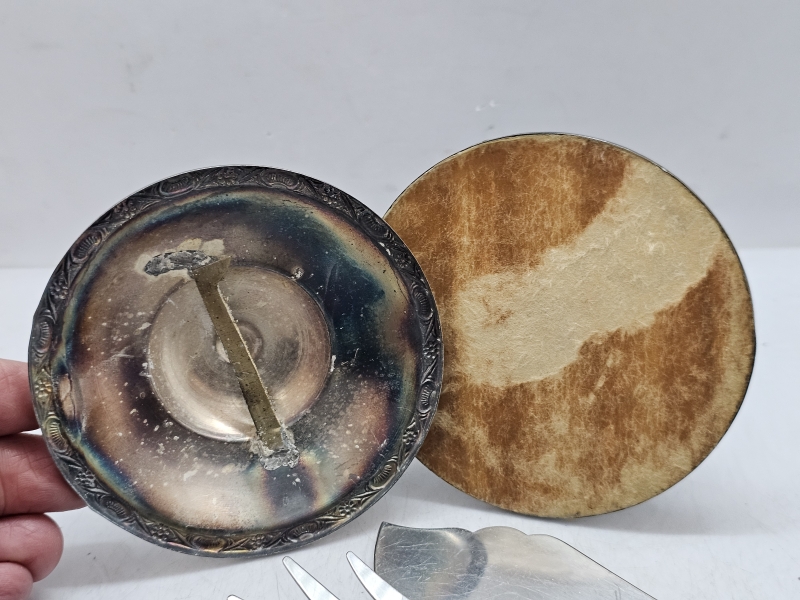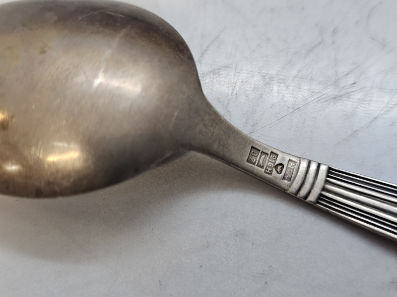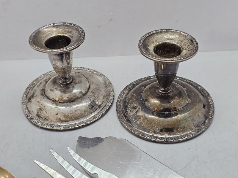 #1067 Hopeaa: Kynttilänjalat [813h], kakkuottimet [830h] teräskärjillä + Margit -lusikka [916h]. Br. 363g