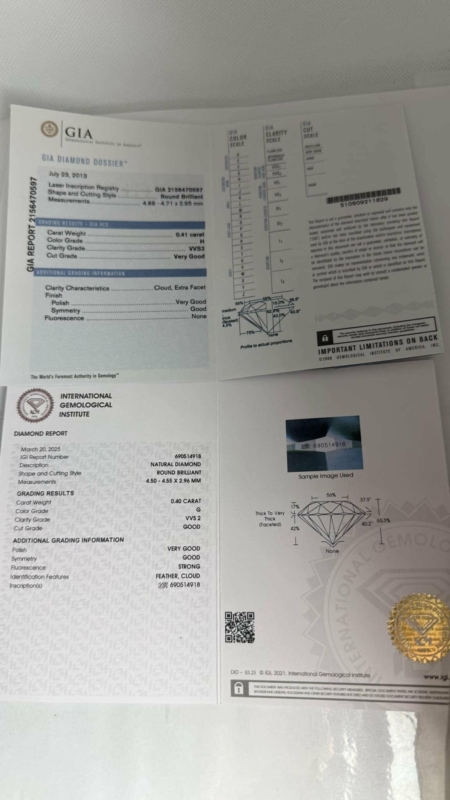 Bruttopaino 0,65g. Mukana IGI -todistus ja toiseen timanttiin GIA -todistus. Laserilla merkitty.