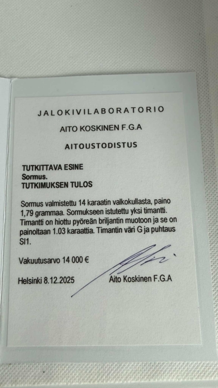 Bruttopaino 1,79g. Mukana aitoustodistus. Koko 17.