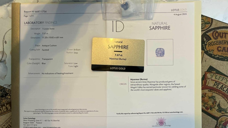 #1199 7,57ct safiiri käsittelemätön + aitoustodistus