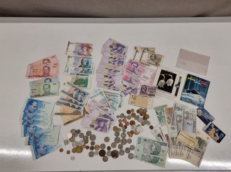#2005 - Iso erä seteleitä ja kolikoita. Mm. Ruotsi 500 kruunua, Paavo Nurmi 10mk 1986 vuoden seteleitä