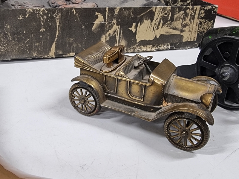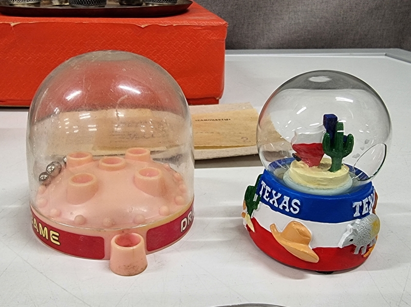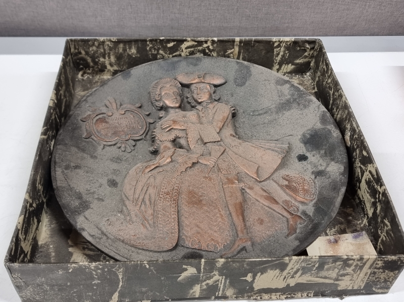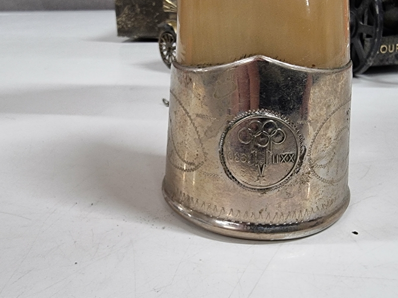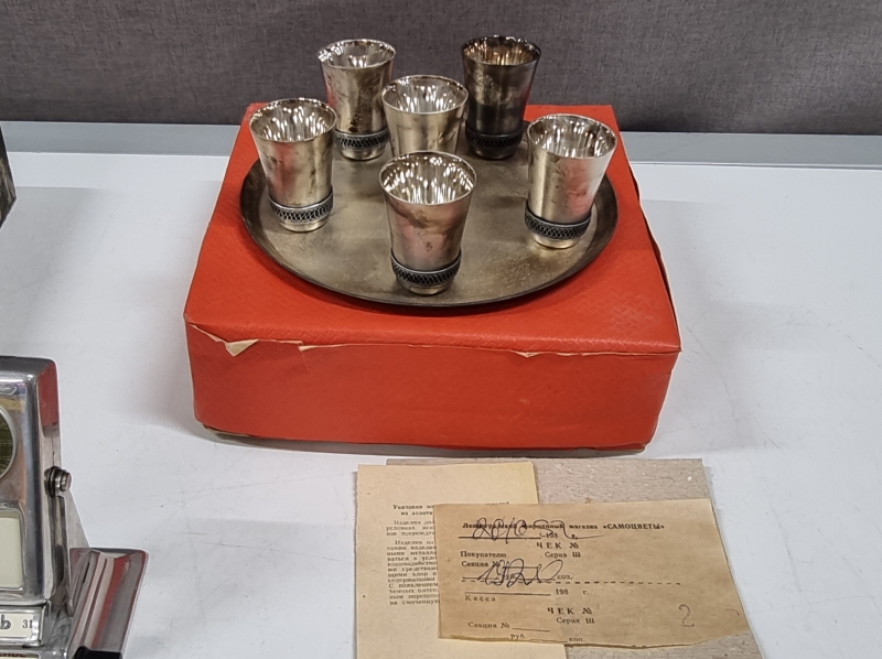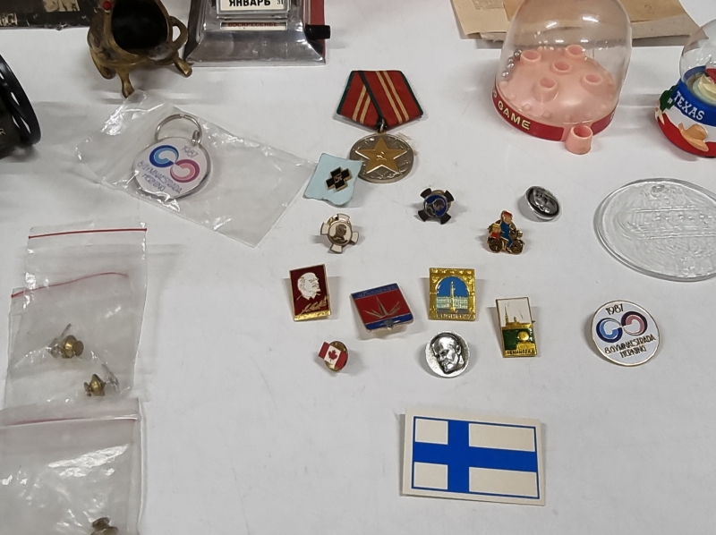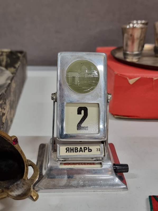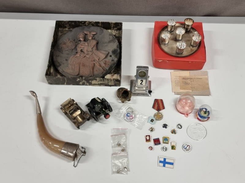 #2449 Erä tavaraa: Metallinen seinälautanen, pöytäkalenteri, snapsisetti, Moskovan Olympialaisten sarvi
