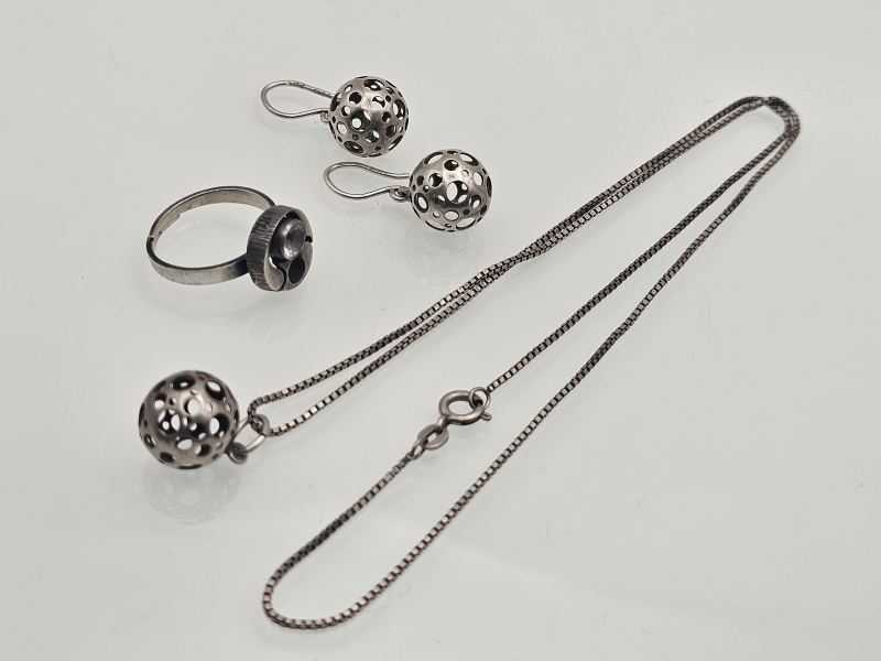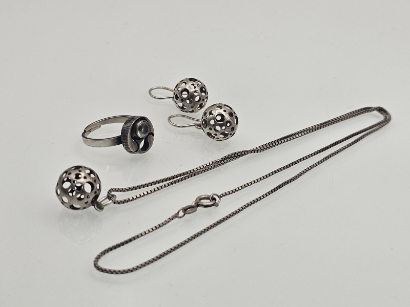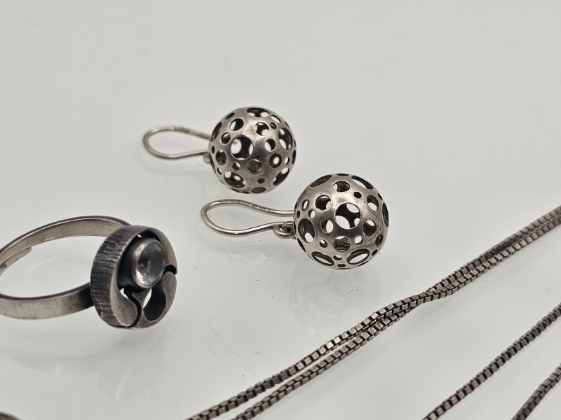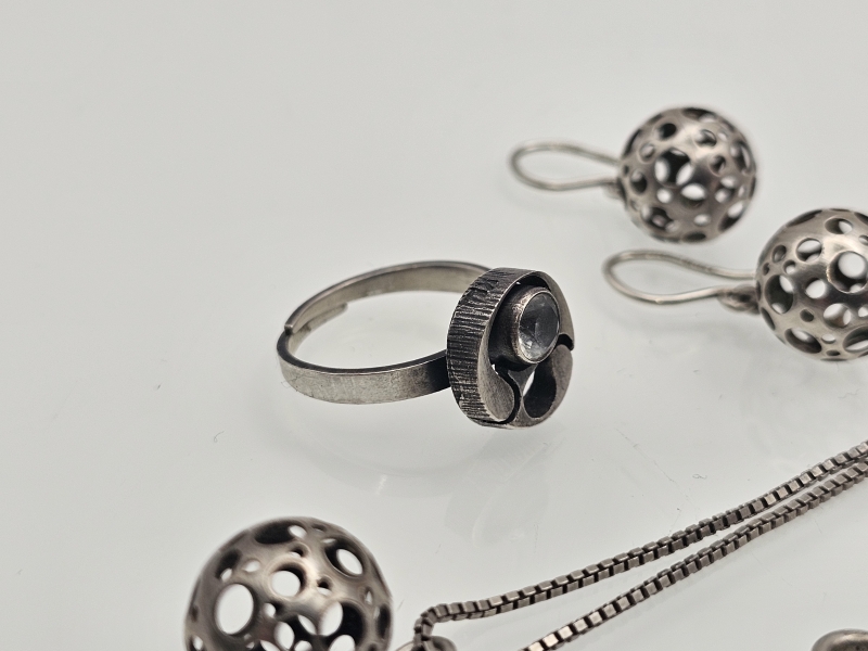 #1095 - Hopeinen Karl Laine sormus & hopeiset Liisa Vitali korvakorut ja kaulakoru