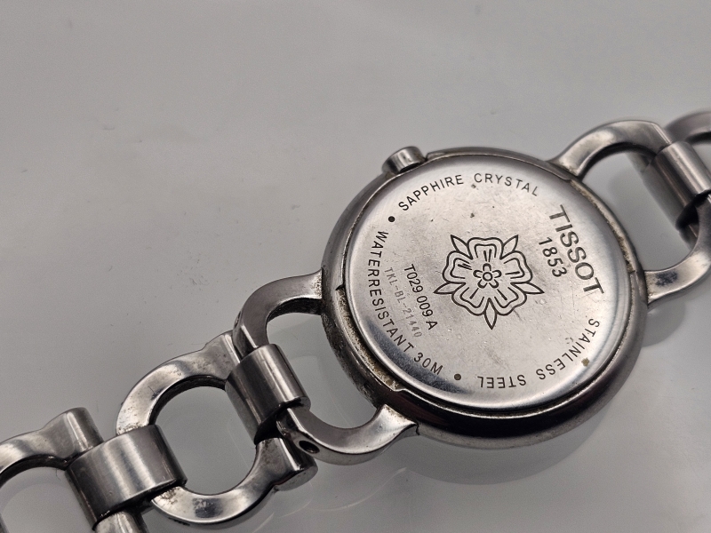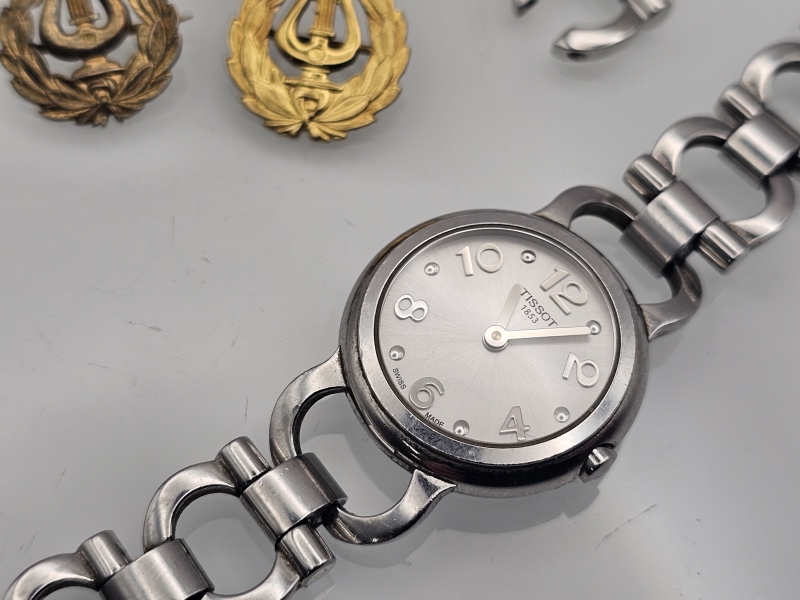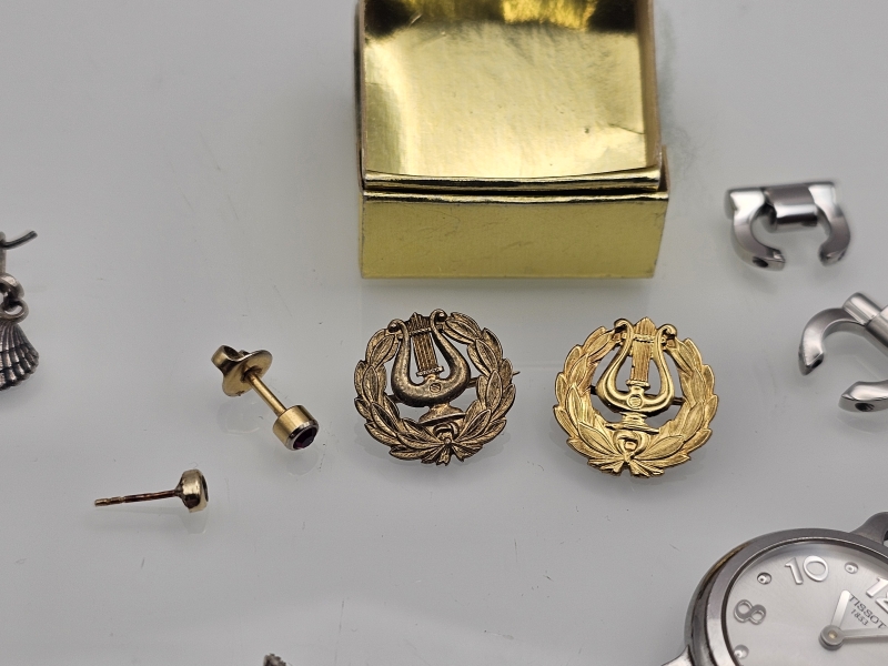 #1103 Tissot rannekello & hopeisia korvakoruja & kullatut lyyrat ym.
