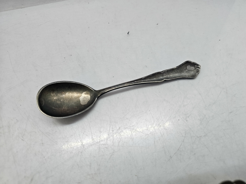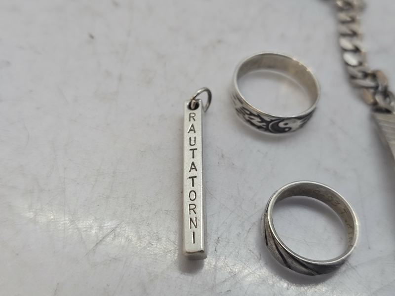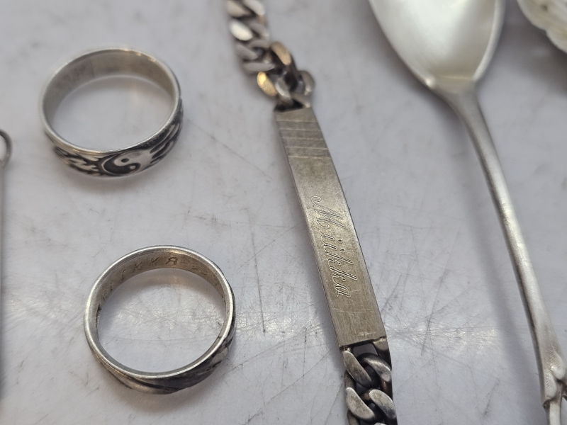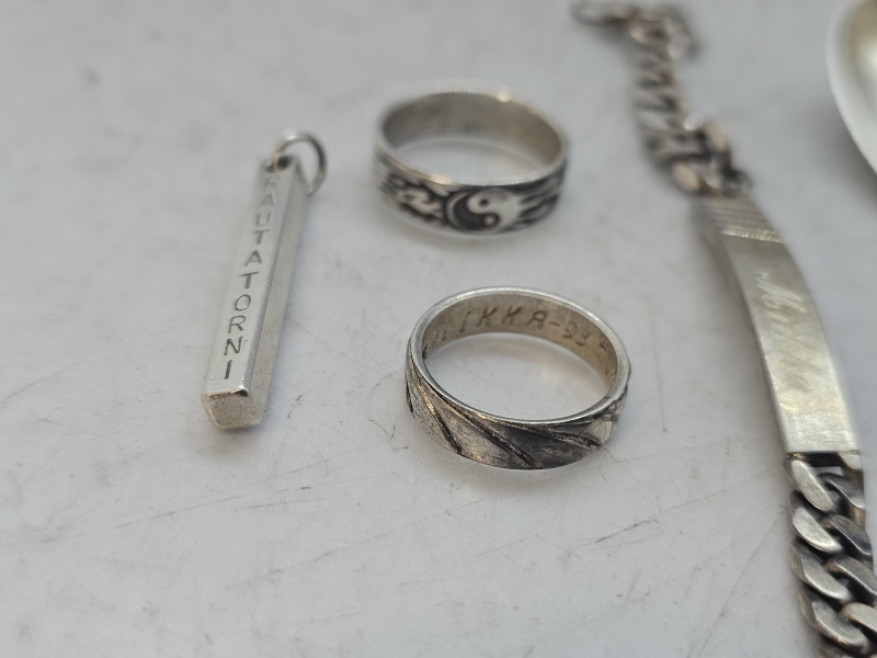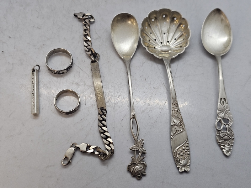 #1106 - Erä hopeaa: Lusikoita, rannekoru, sormuksia ym. + 1kpl alpakkalusikka