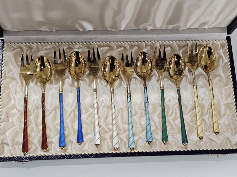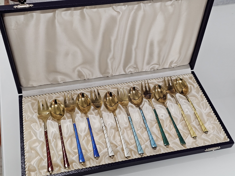 #1129 6+6kpl emalihopea haarukoita ja lusikoita, Egon Lauridsen, Tanska. 925h, 195g