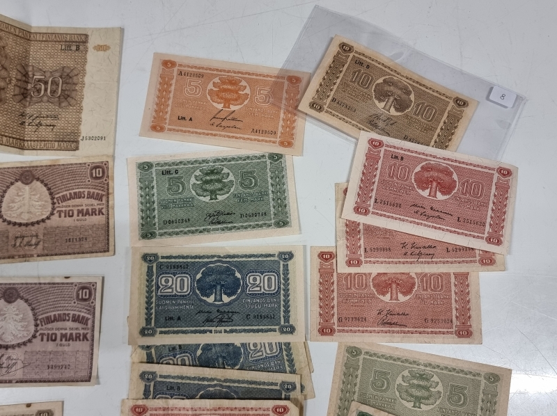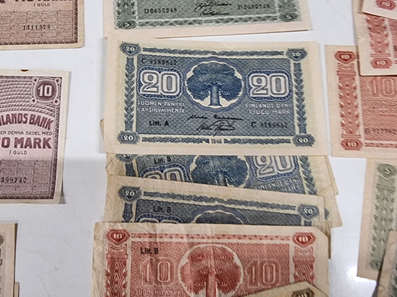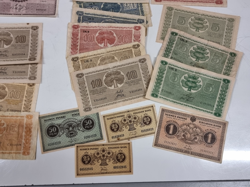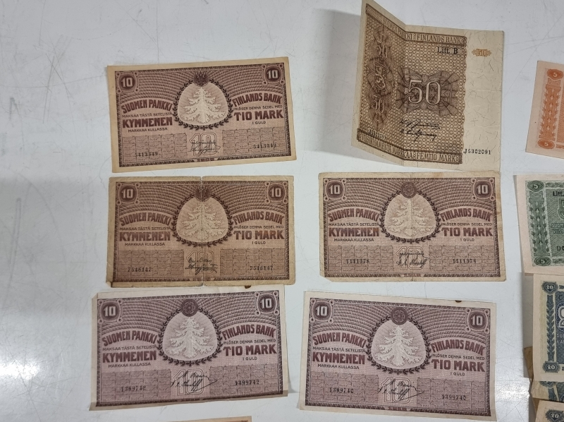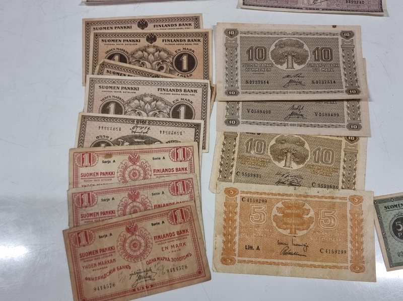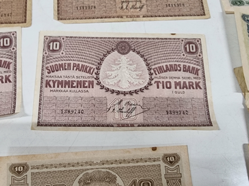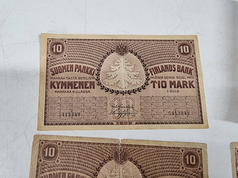 #2022 Hyvä erä vanhoja suomalaisia seteleitä: 3kpl 1mk v. 1915, 2kpl 10mk v. 1918