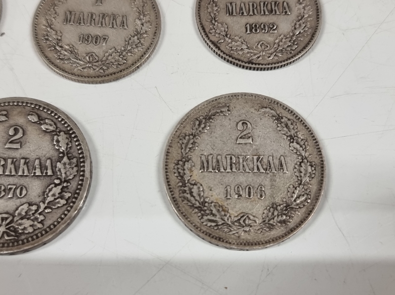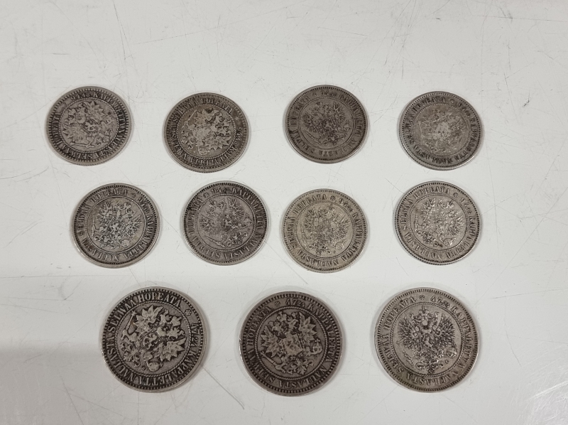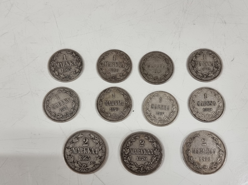 #1212 - 11kpl hopeisia suomalaisia kolikoita: Mm. 2mk ja 1mk v. 1865. 868h, 71g