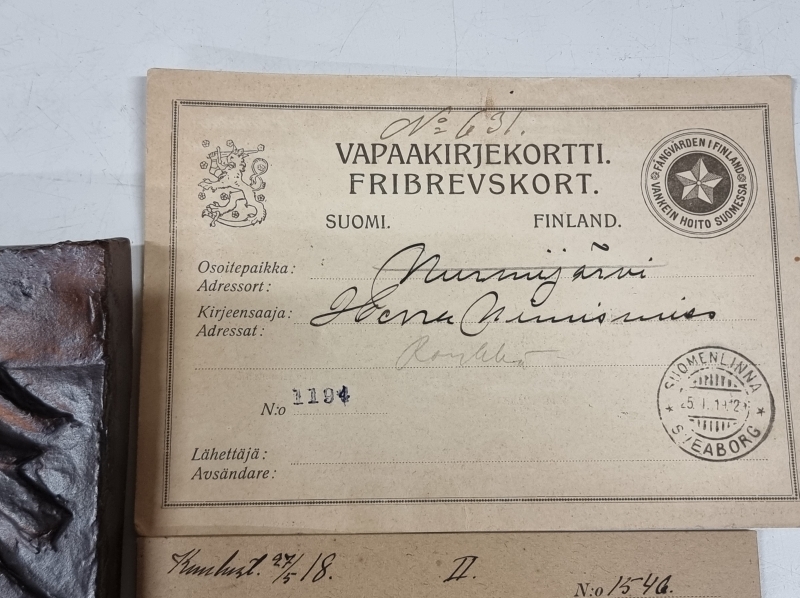 #1663 - Punakaartin esineitä: "Tulivuori"-, kahle-, työväen järjestyskaartin merkki, reliefi ym.