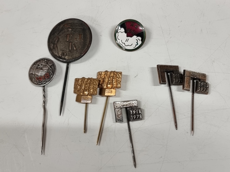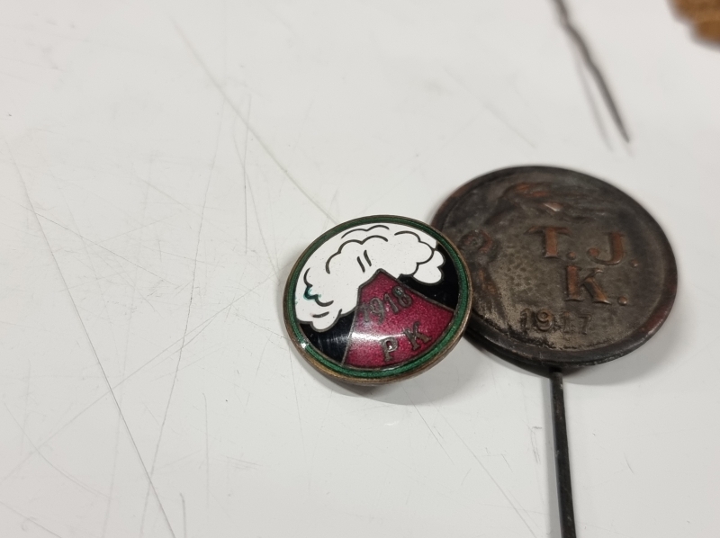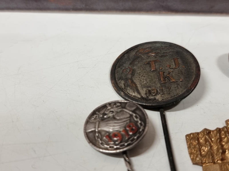 #1663 Punakaartin esineitä: "Tulivuori"-, kahle-, työväen järjestyskaartin merkki, reliefi ym.