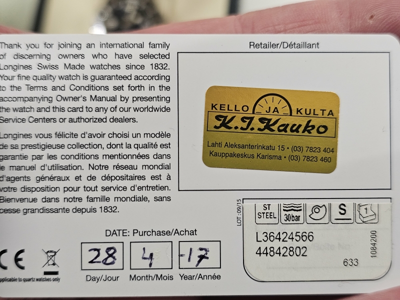 Mukana laatikko, aitoutuskortti ym. Ref: L3.642.4.56.6. Halk: 41mm