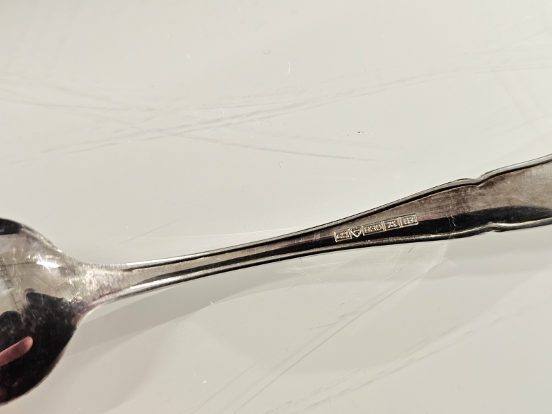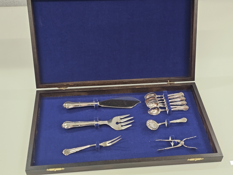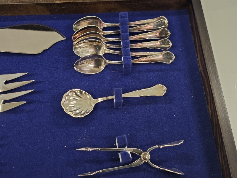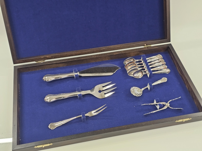 #1190 - Hopeinen chippendale kahvittelusarja säilytyslaatikossa, 830h, 126g + br. 148g