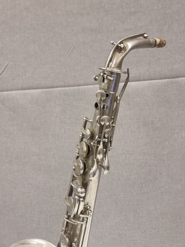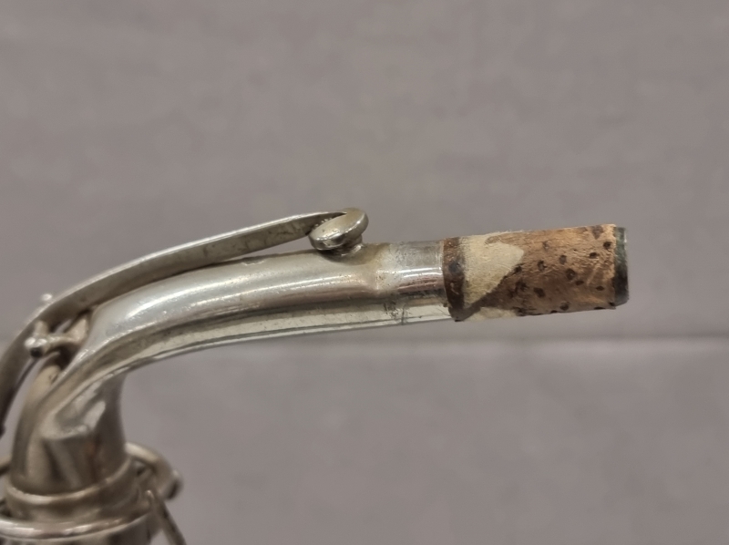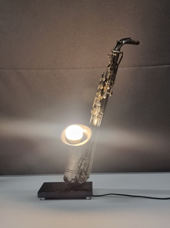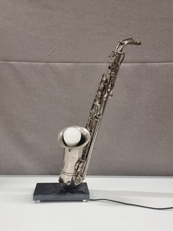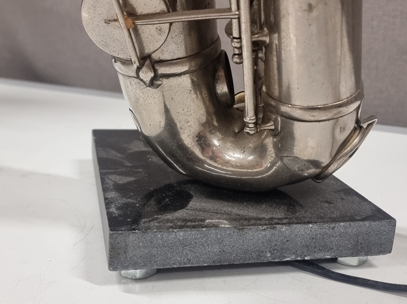 #2222 - Saksofonista tehty pöytävalaisin kivijalustalla
