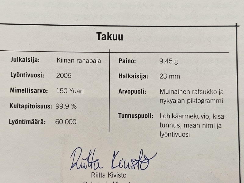 Paino 9,45g. Mukana aitoustodistus ja rasia. Pitoisuus 999/1000