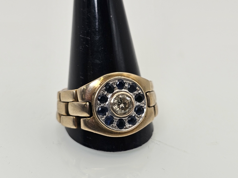 #1268 Noin 8k kultainen sormus n. 0,47ct timantilla ja sinisafiireilla, 12,22g