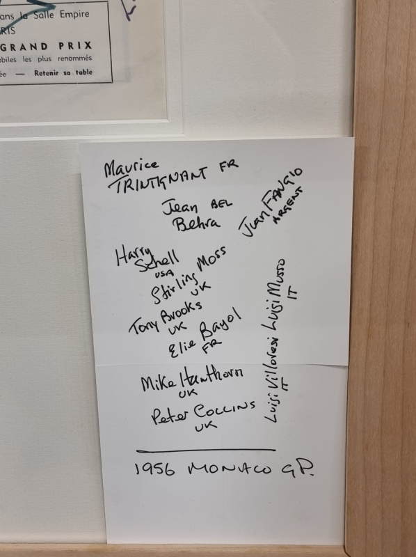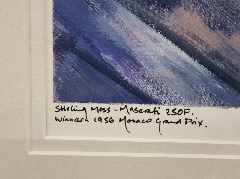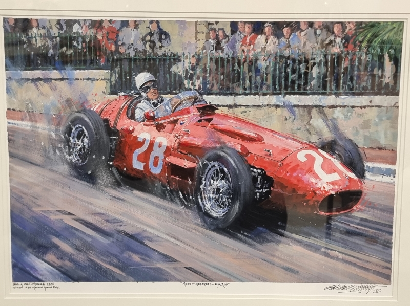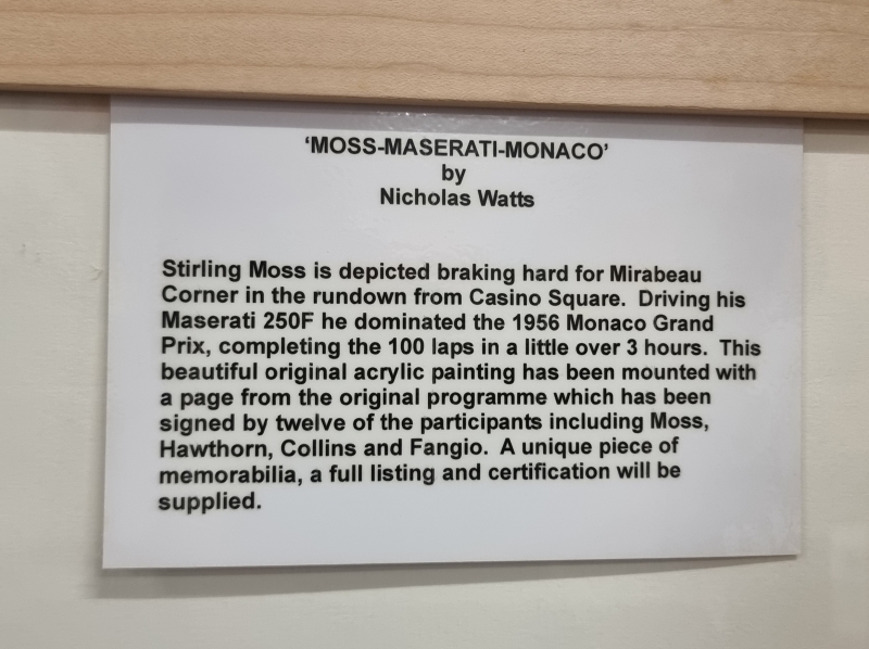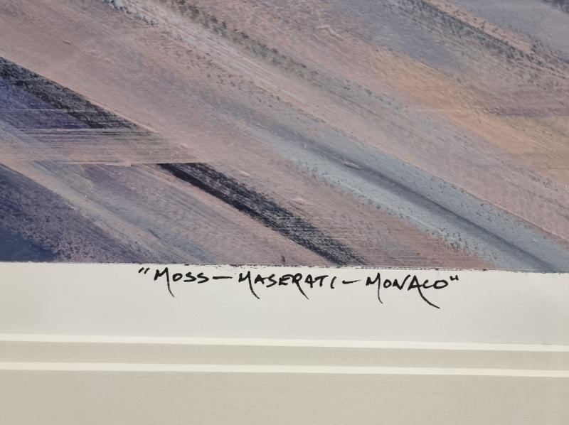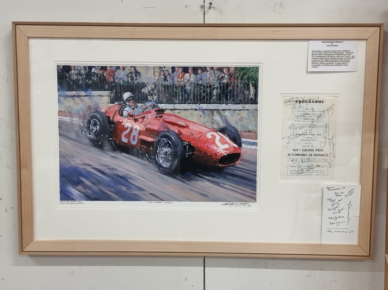 #1005 Nicholas Watts signeerattu akryylimaalaus + 1956 Monacon GP käsiohjelma kuljettajien nimikirjoituksilla: Juan Fangio, Stirling Moss ym.