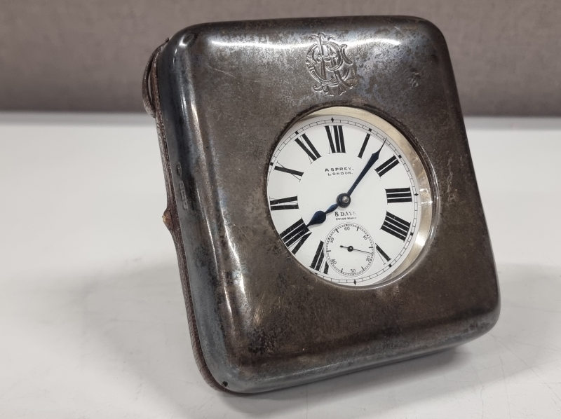 #1242 Harvinainen hopeinen Asprey 8 days taskukello alkuperäisellä kotelolla. 935h brutto 293g. Kotelon paino 183g