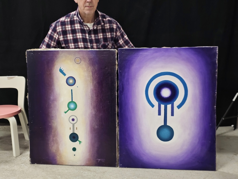 #2098 - 2kpl öljyvärimaalauksia, Timo Teide, toinen "Kosminen kohdentaja" 1995