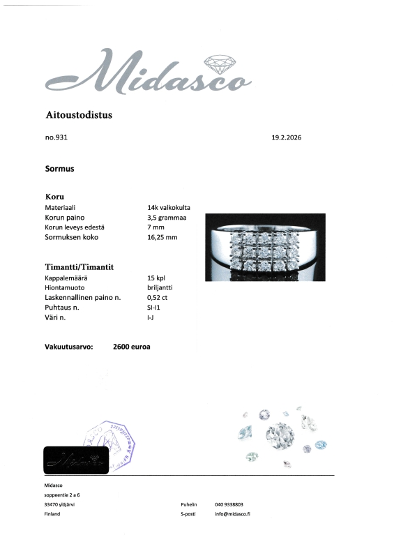 Mukana aitoustodistus sekä uusi korurasia. Koko hyvin muokattavissa ammattilaisen toimesta (ei sis. hintaan). Puhdistettu ja kiillotettu. Bruttopaino 3,5g. Koko 16,25.