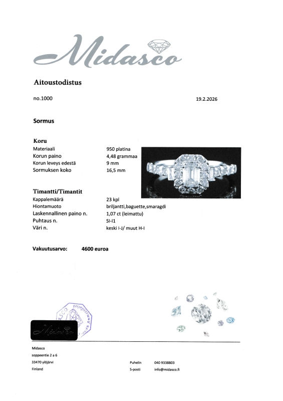 Mukana aitoustodistus sekä uusi korurasia. Koko hyvin muokattavissa ammattilaisen toimesta (ei sis. hintaan. Puhdistettu ja kiillotettu. Bruttopaino 4,48g. Koko 16,5.
