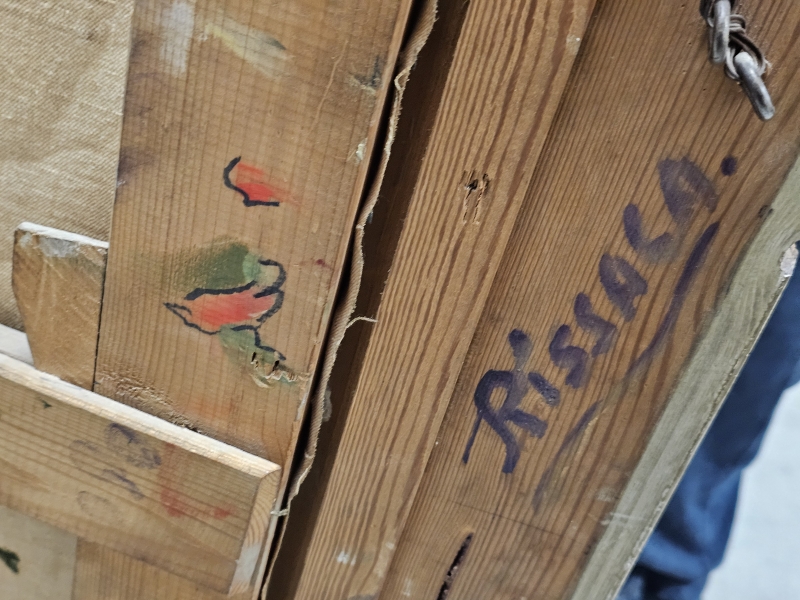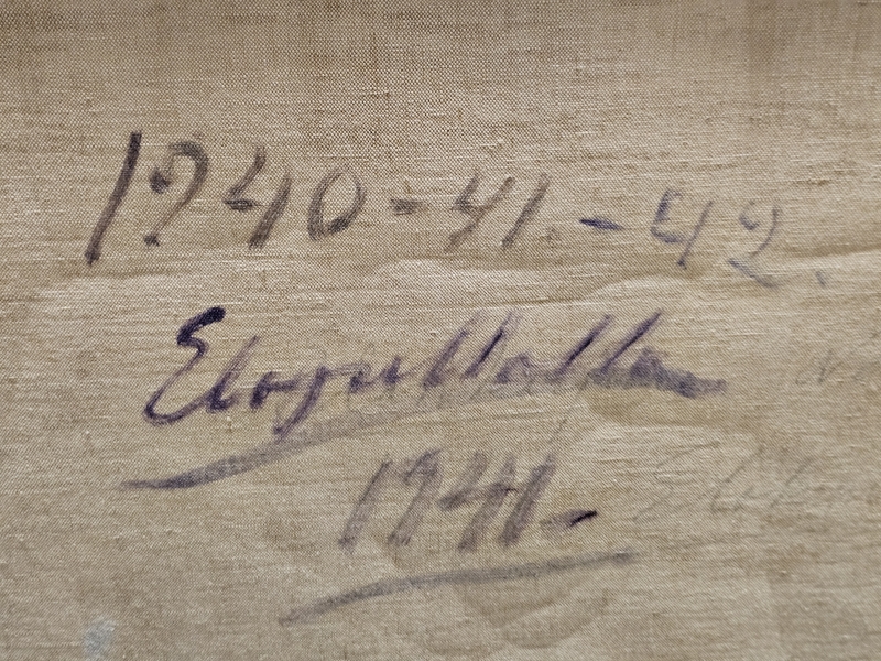 Maalissa joitakin halkeamia ja kulumaa. Kehyksineen 133,5cm x 164cm
