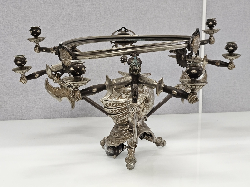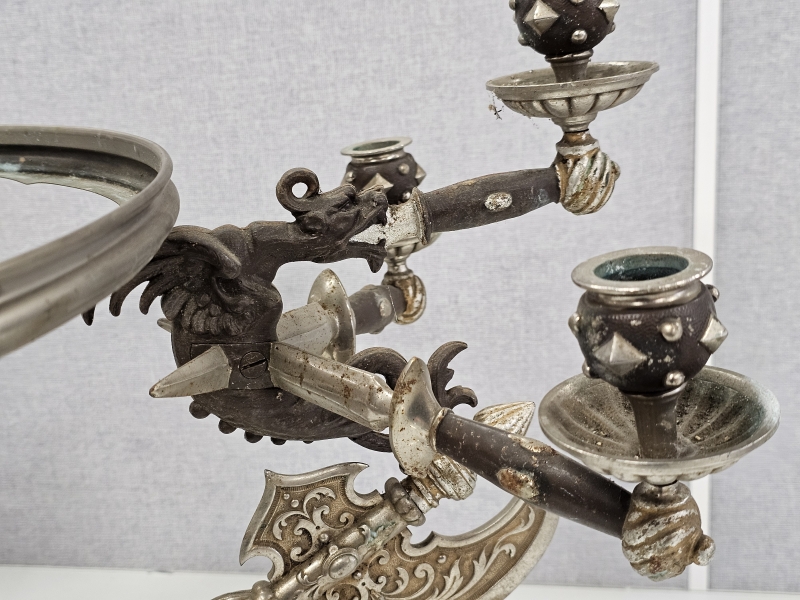 #1851 - Erikoinen metallinen ritariaiheinen pöytäteline kynttiläpaikoilla