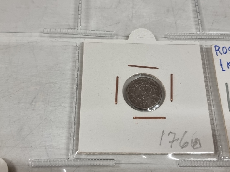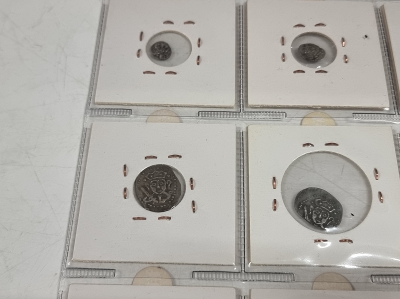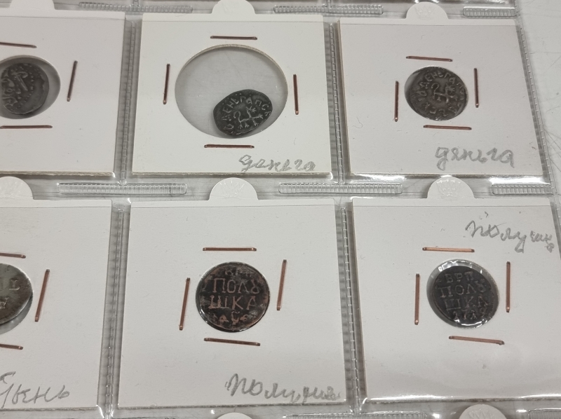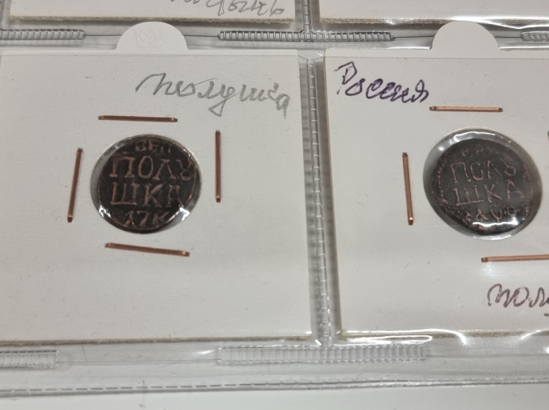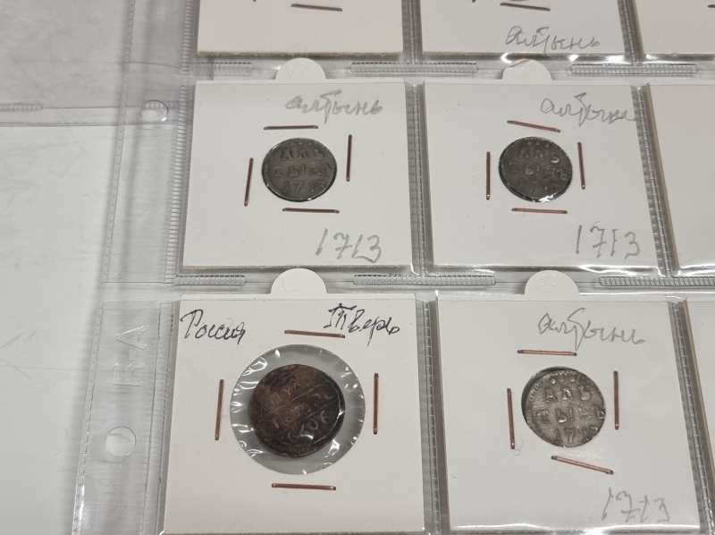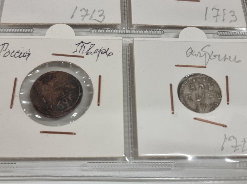 #1384 Hyvä erä vanhoja venäläisiä kolikoita. Osa hopeaa: 1 Altyn Peter I 1713 ym.