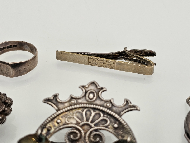 #1410 Erä hopeisia koruja: Mm. tiikerinsilmäriipus