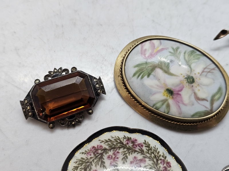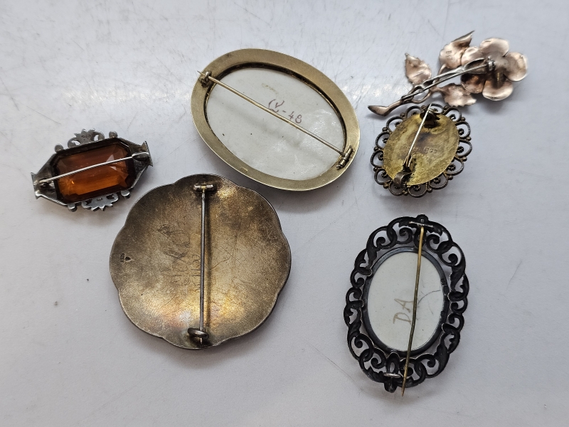 #1412 - Kauniita hopeisia rintakoruja: Mm. Emalikoristeella, signeerattu posliininen
