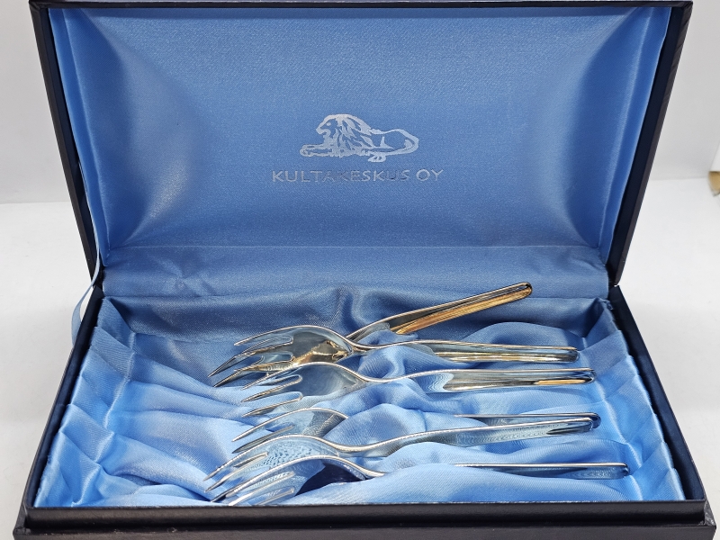 #1446 6kpl hopeisia Tapio Wirkkala haarukoita, 830h, 150g + laatikko