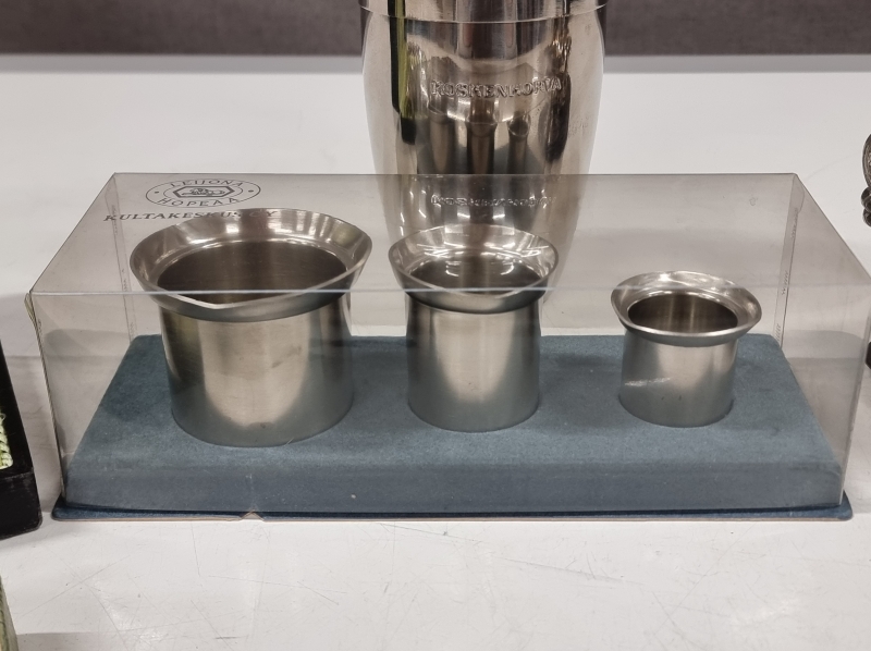 #2456 Erä tavaraa: mm. Musla alpakkalusikat, viinamitat ja shaker