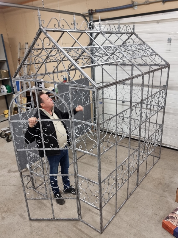 160 cm x 245cm, korkeus koristeen kanssa 297cm. Helppo purkaa ja kasata.