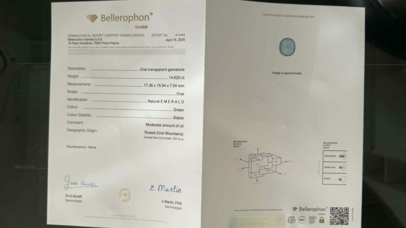 #1499 - 14,62ct smaragdi + Bellerophon -todistus