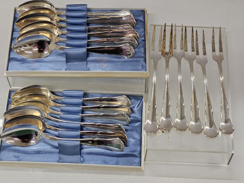 #930 12kpl hopeisia chippendale kahvilusikoita + 6kpl otinhaarukoita, 830h, 203g