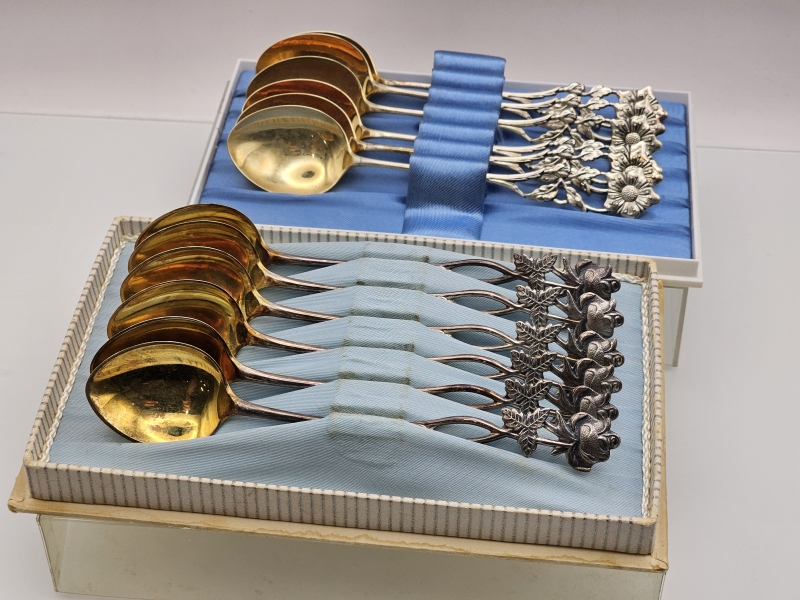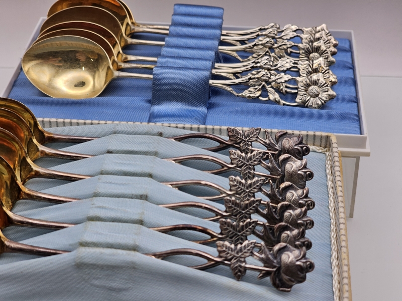 #934 - 6+6kpl hopeisia kahvilusikoita kukkapäillä, 813-830h, 115g