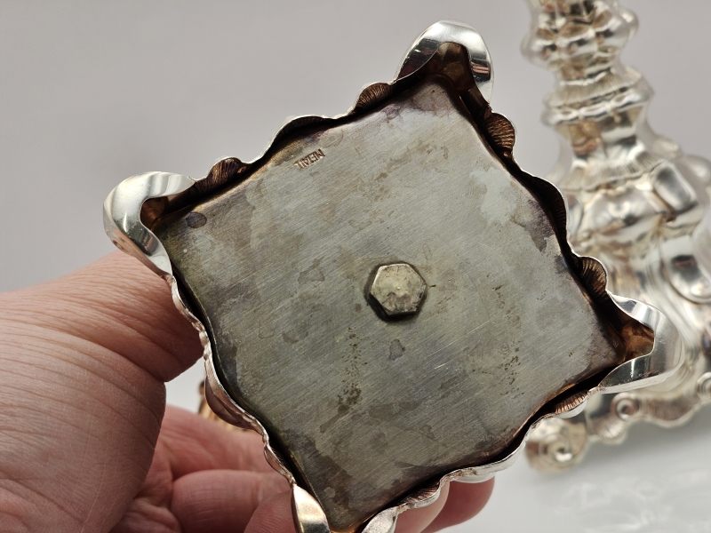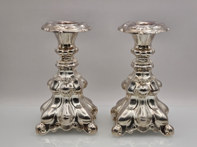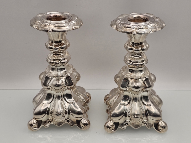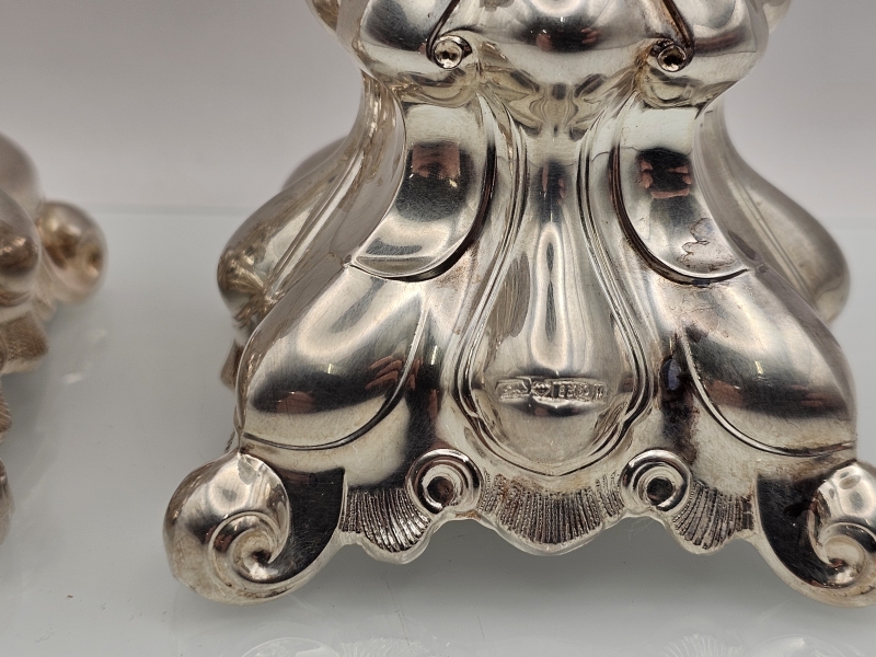 #923 2kpl hopeisia Barokki-kynttilänjalkoja, 830h, br. 392g