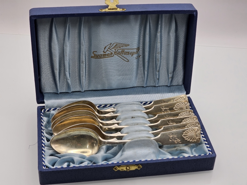 #958 6kpl hopeisia kahvilusikoita v. 1956 Hankiralli -kotelossa, 813h, 90g