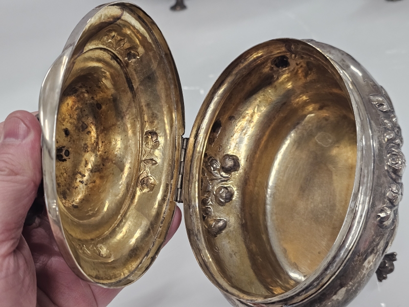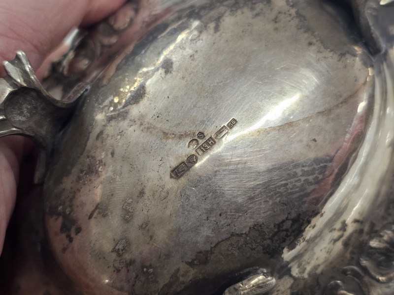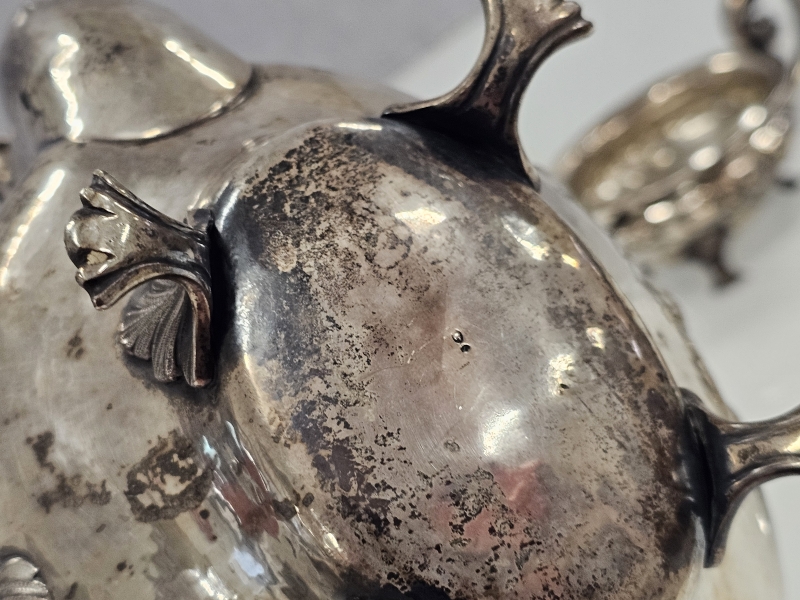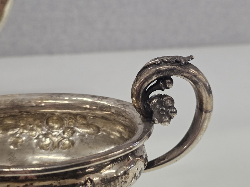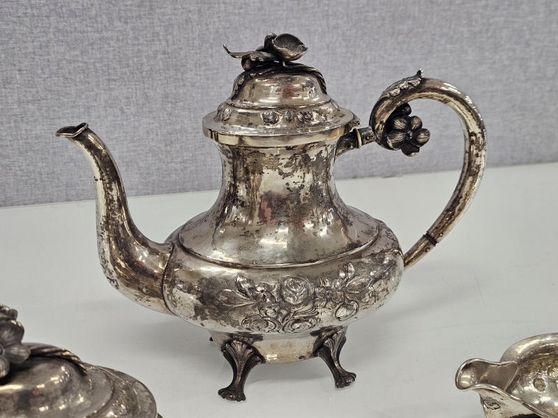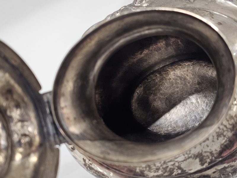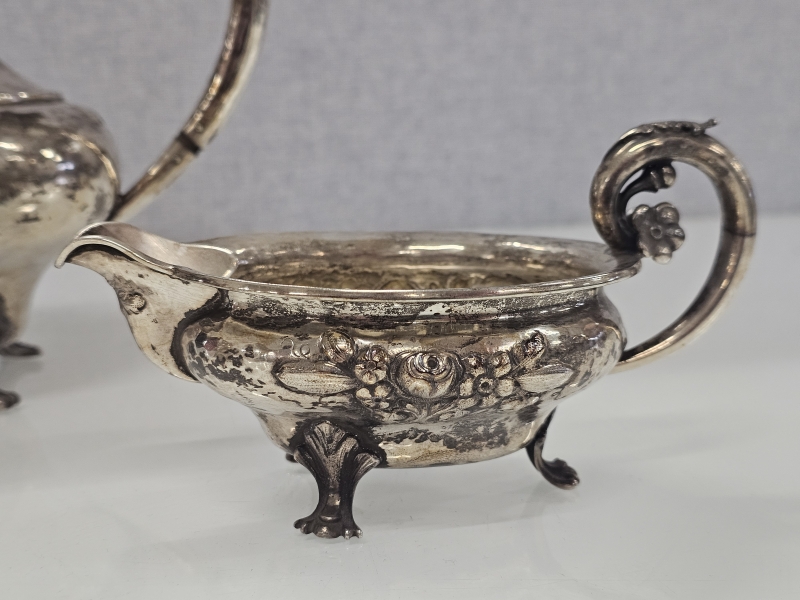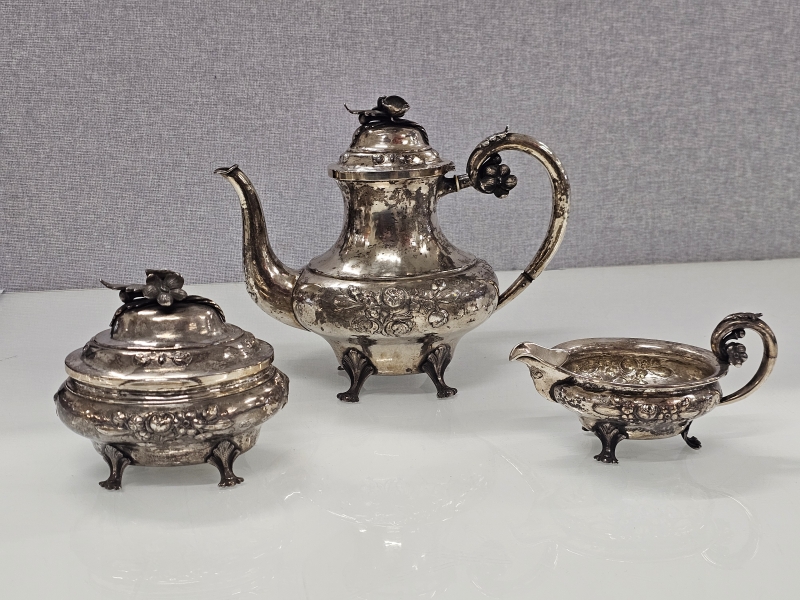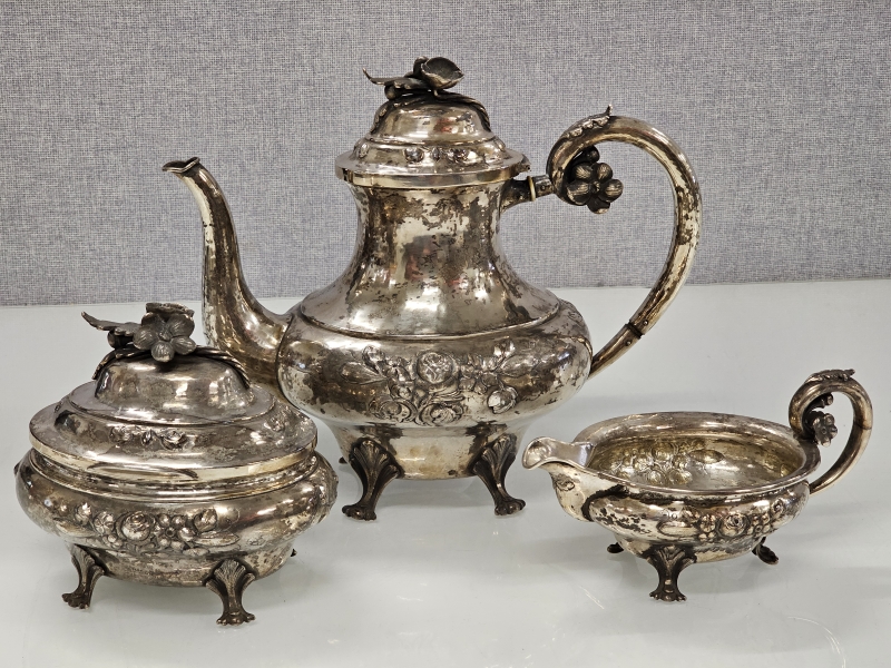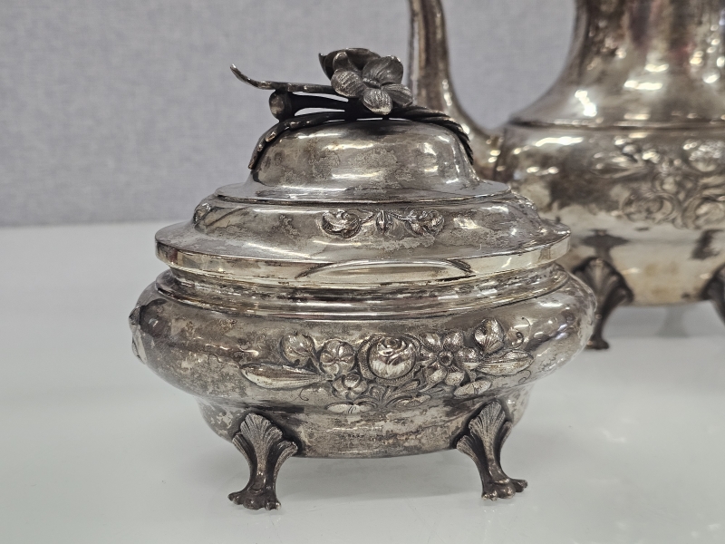 #963 Hopeinen vanha taottu kahvikalusto, 3-osaa, 813h, 1260g