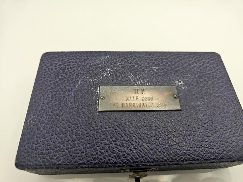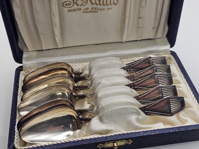 #967 - 6kpl hopeisia Suomi-kahvilusikoita [v.1957] Hankiralli -rasiassa, 813h, 86g