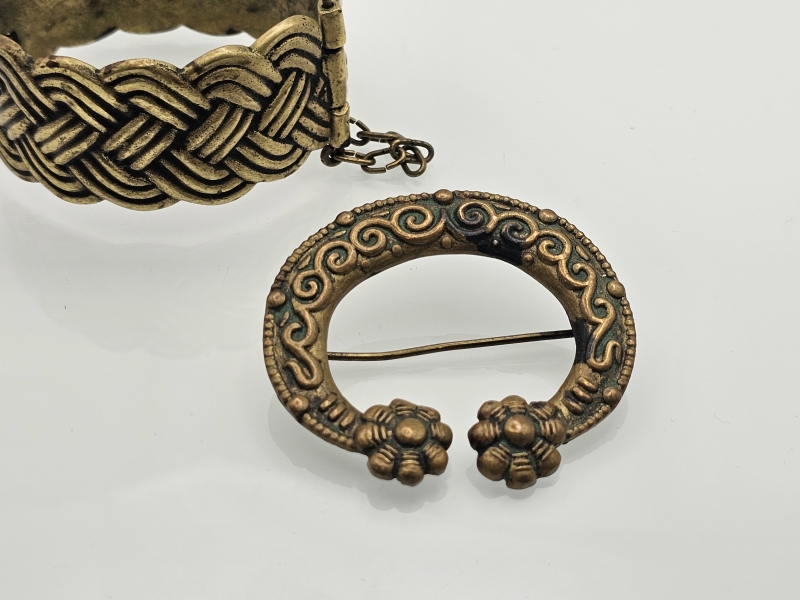 #985 2kpl pronssisia Kalevala korun koruja: Karjalainen nauhapujotelma & solki