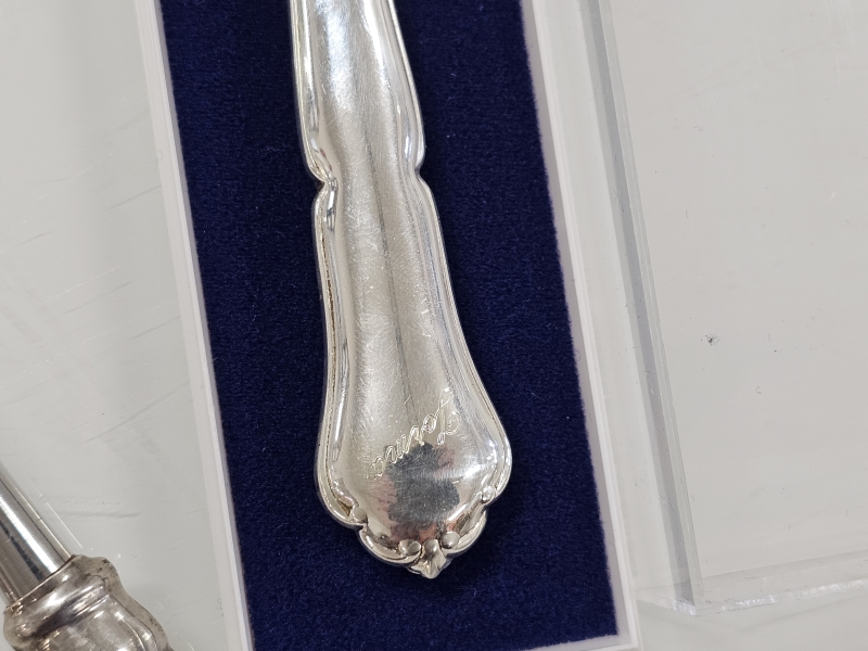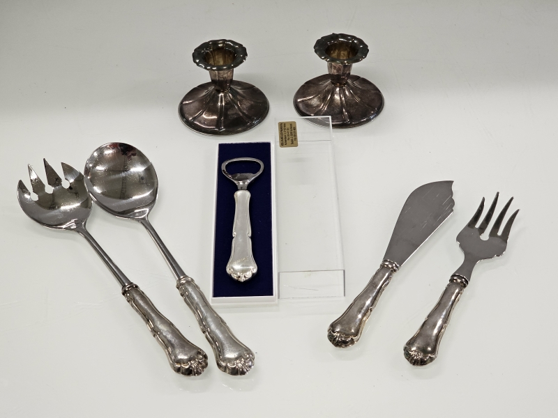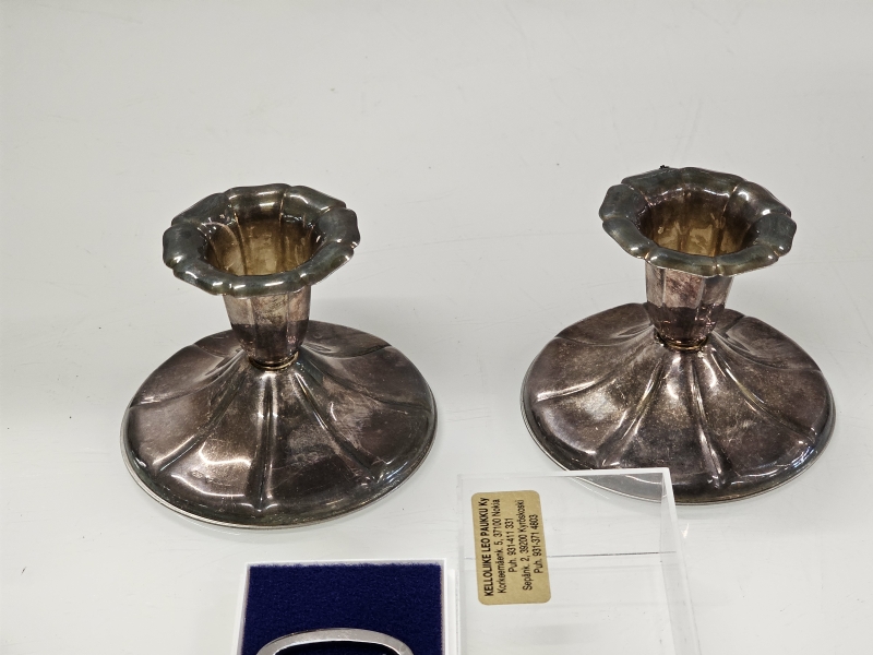 Pitoisuus 830/1000, kärjet hopeaa. Kynttilänjalkojen br. paino 128g. Yhdessä kaiverrus