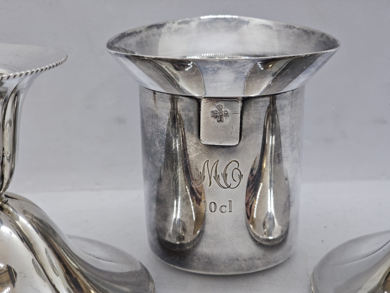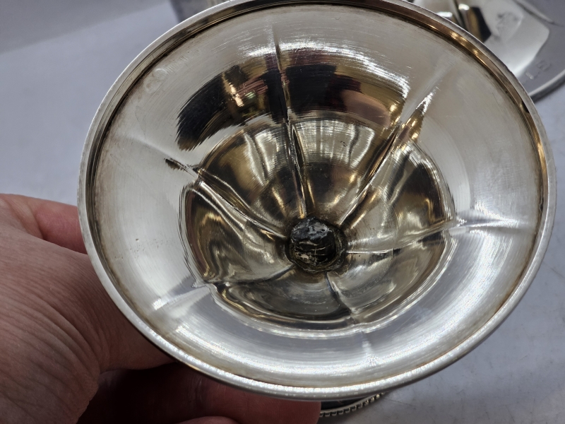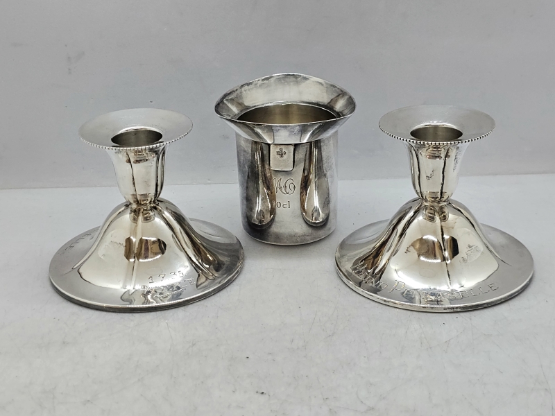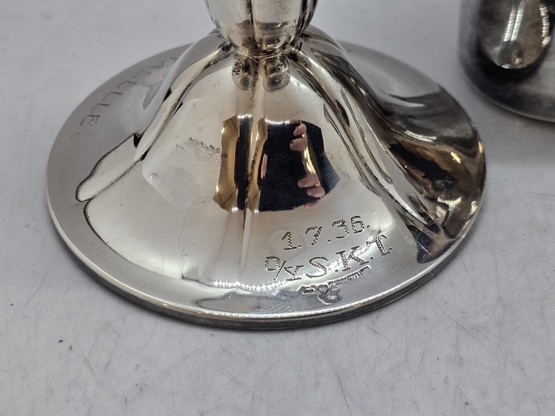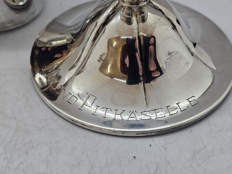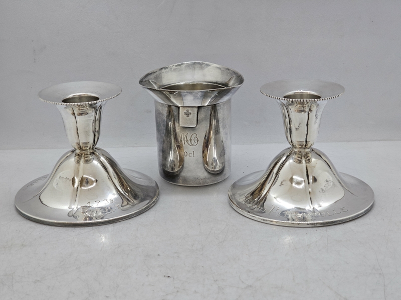 #838 2kpl hopeisia kynttilänjalkoja, 813h, br. 140g + alpakka viinamitta