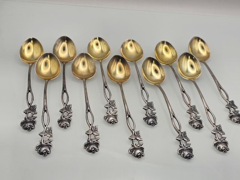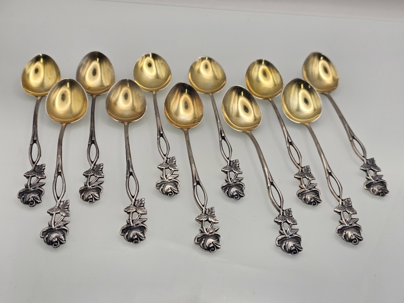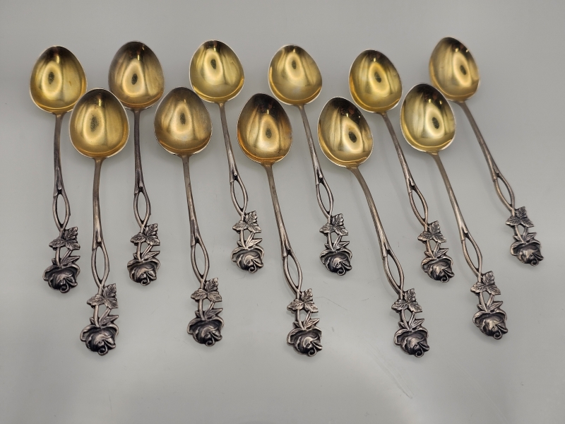 #822 11kpl hopeisia kukkapäisiä kahvilusikoita, 813h, 97g