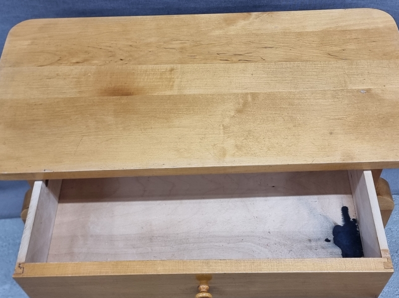 Kulumaa, pinnassa kolhuja, laatikon sisällä mustetahra. L: 70cm S: 35cm K: 60cm