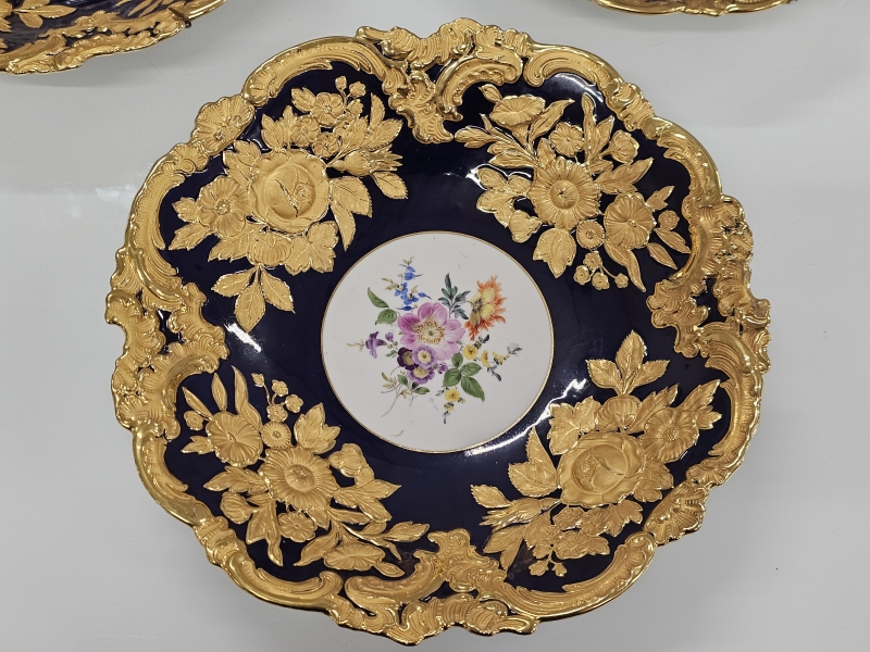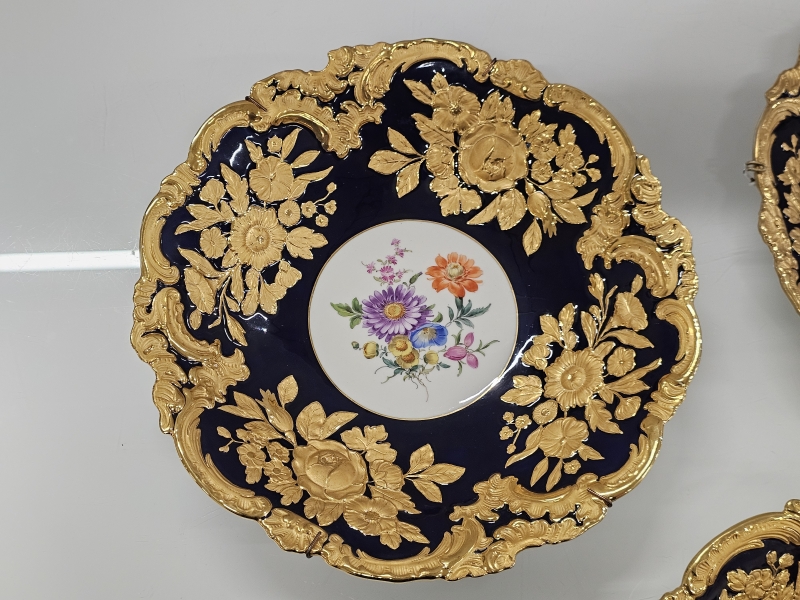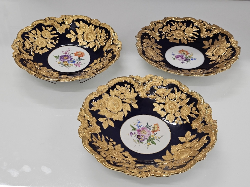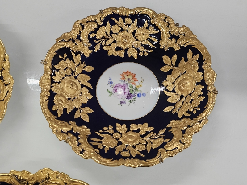 #722 Poikkeuksellisen näyttävä kolmen Meissen -koristelautasen sarja
