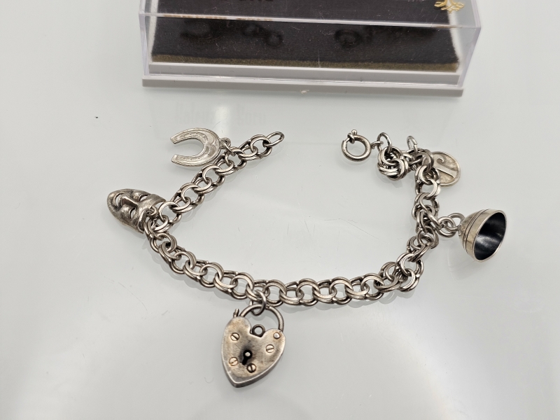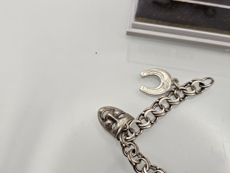 #1194 - Hopeinen rannekoru keräilyosilla, mm. Englanti 1968