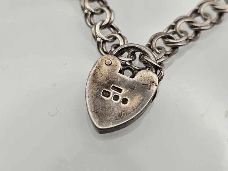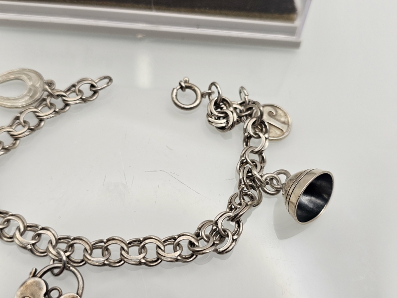 #1194 Hopeinen rannekoru keräilyosilla, mm. Englanti 1968