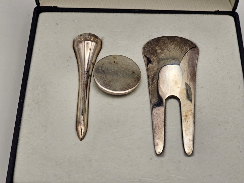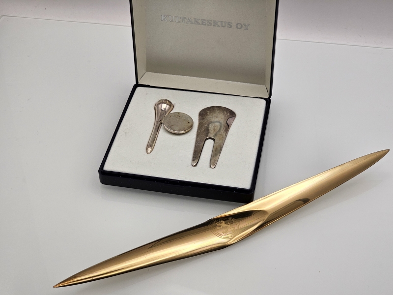 #1145 Hopeinen golfsetti & Tapio Wirkkala pronssi paperiveitsi