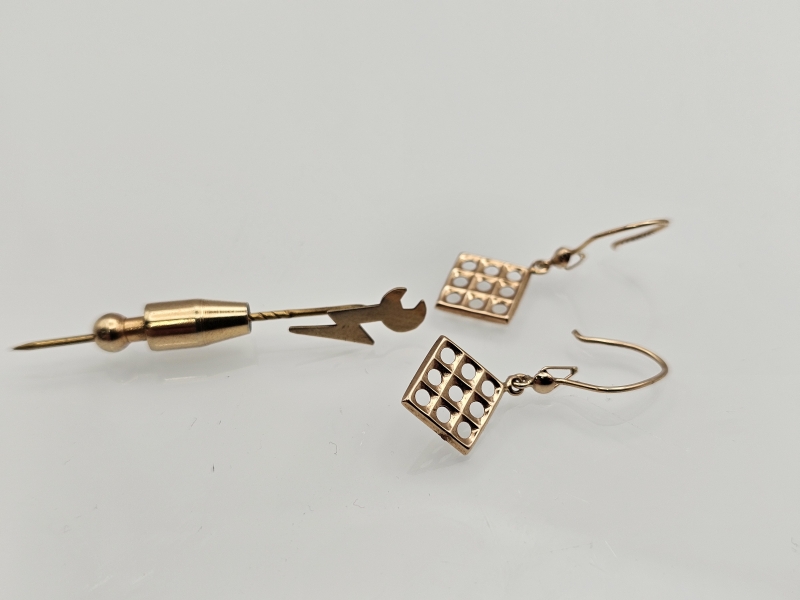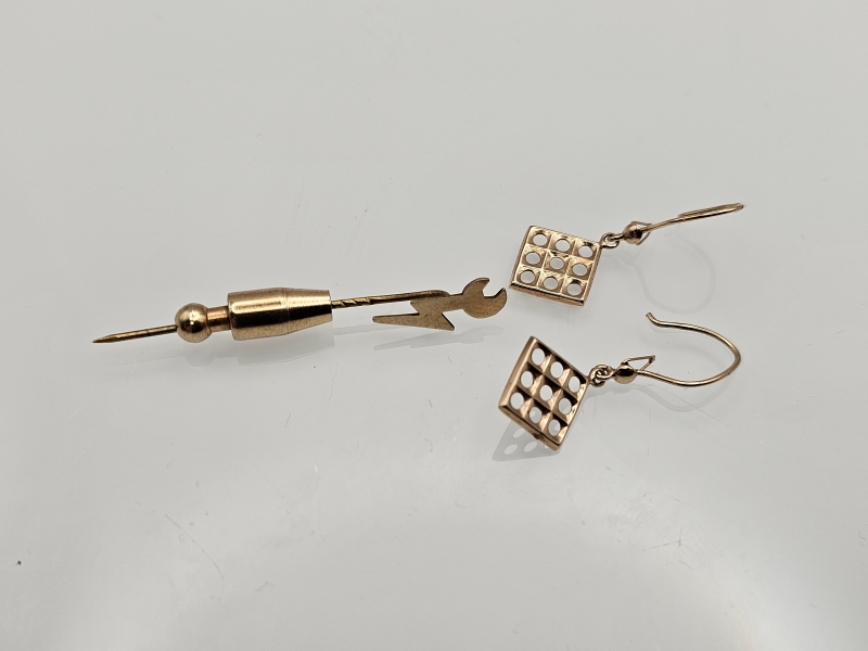 #1230 - 14k kultaiset korvakorut + rintaneula, 1,45g