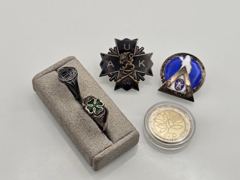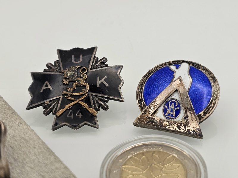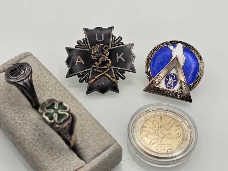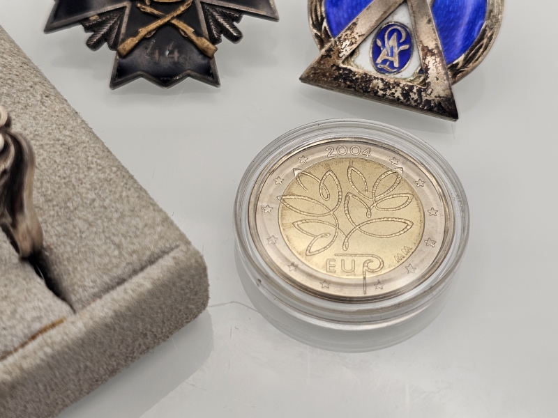 #1649 - 2€ risuraha + hopeisia merkkejä [mm. AUK '44 -risti]